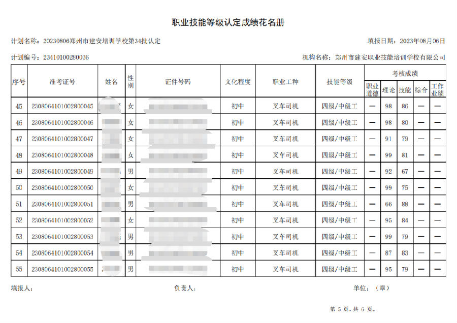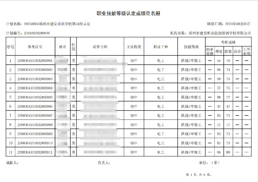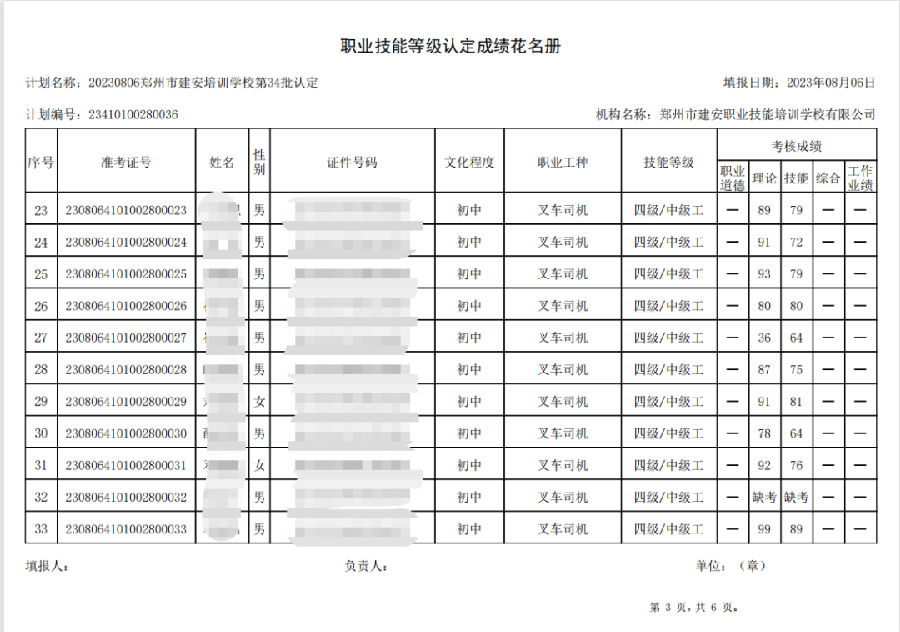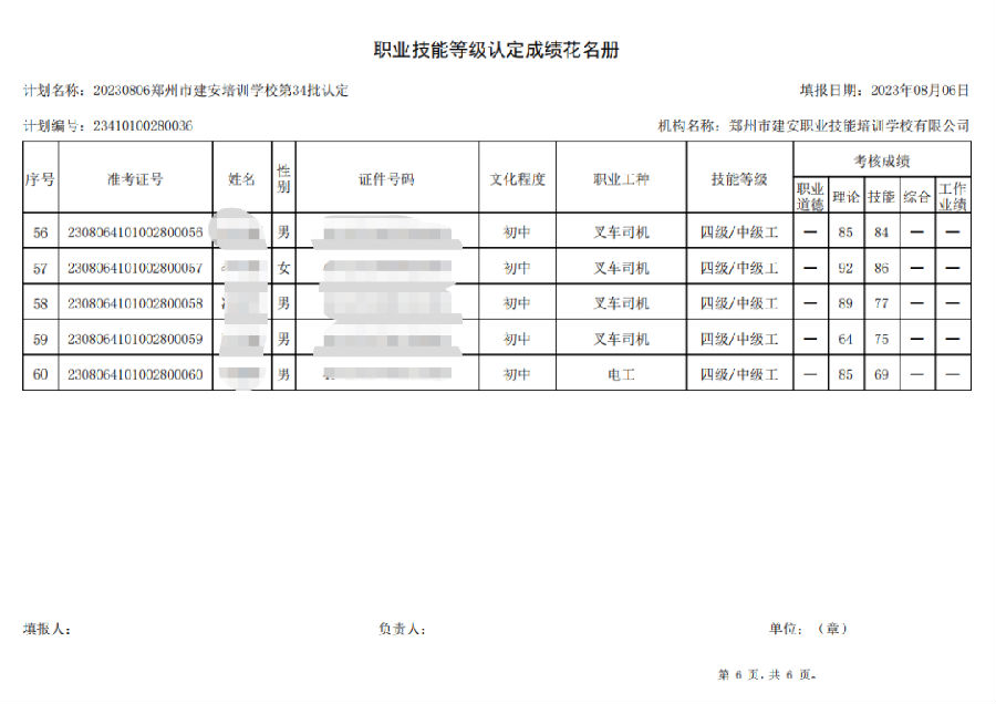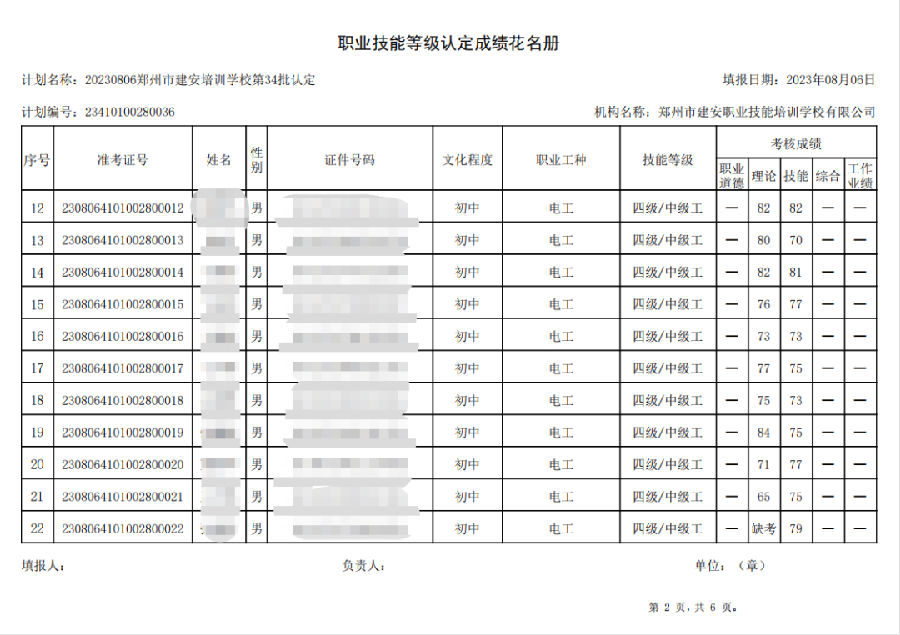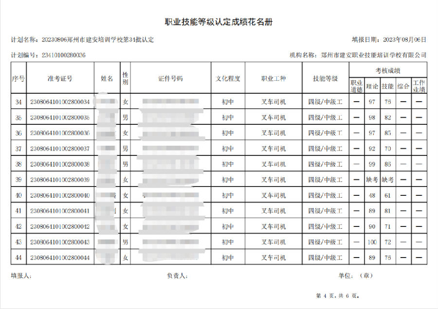 2023年8月6日,在郑州市建安职业技能培训学校进行的第34批次【叉车司机】【电工】职业技能等级认定考试,阅卷工作已结束,现将各位考生成绩予以公示,公示期为3天,公示期限为:2023年8月8日至2023年8月10日。若考生对自己的成绩有异议,请于公示期内(上午8:30至12点,下午13:30到18:00)携带本人身份证,到郑州市高新区玉兰街83号建安职业技能培训学校申请成绩复核。以上,逾期不再受理。
