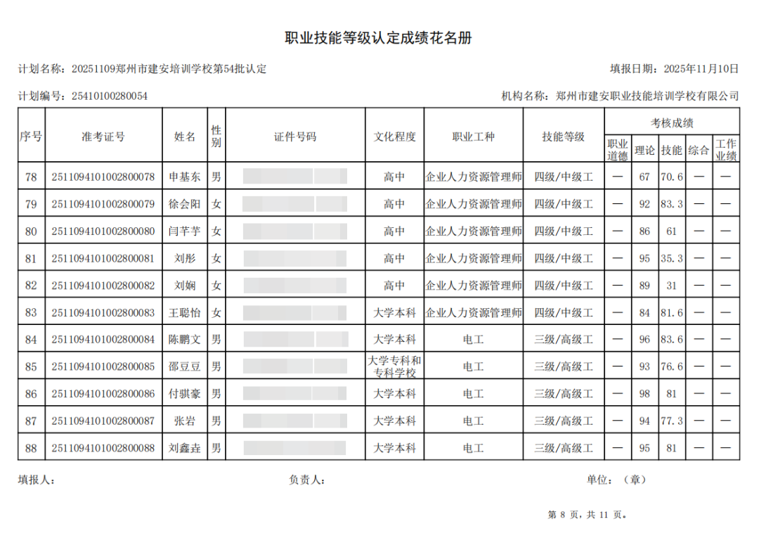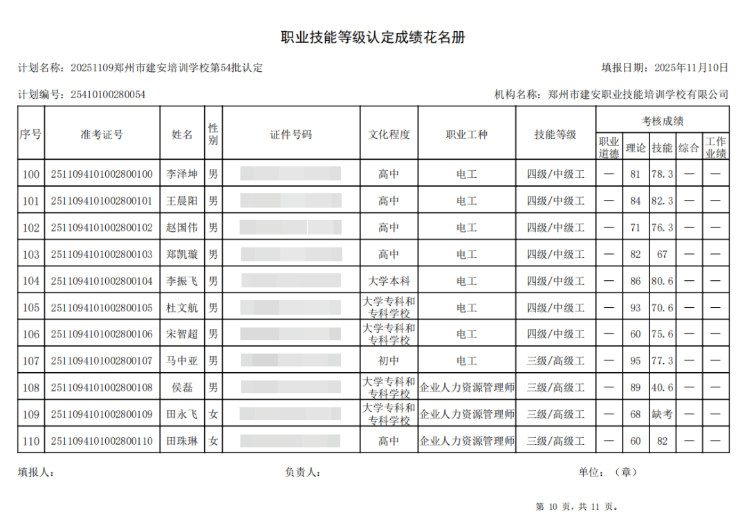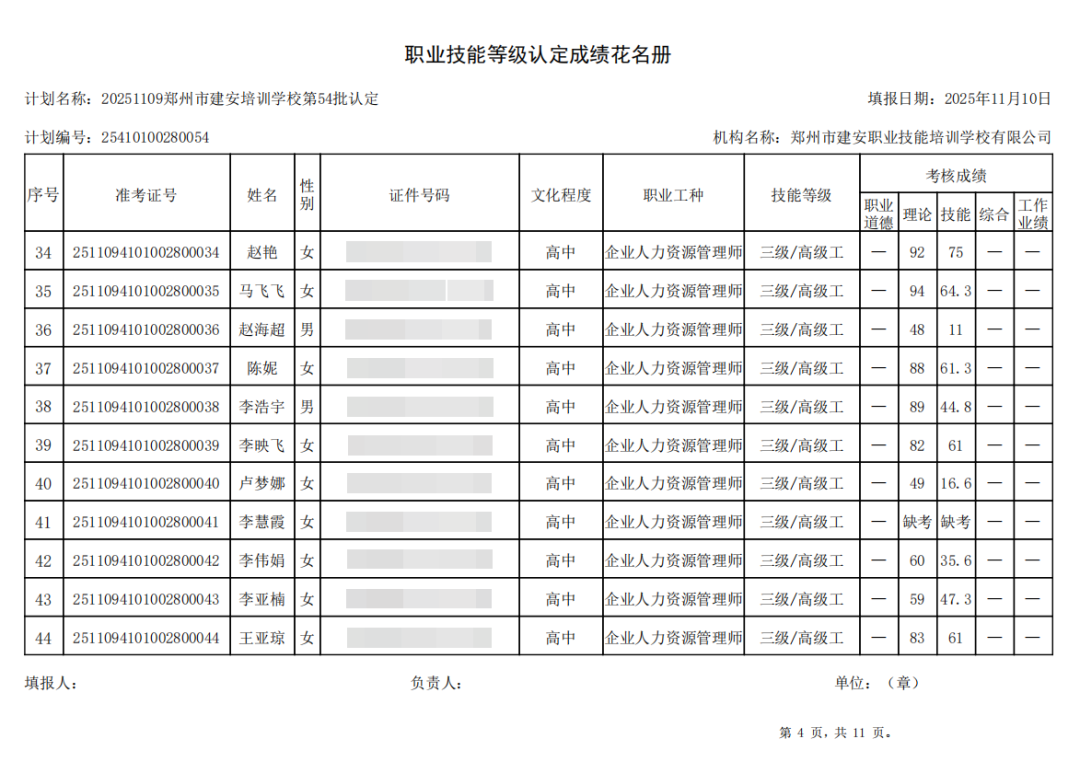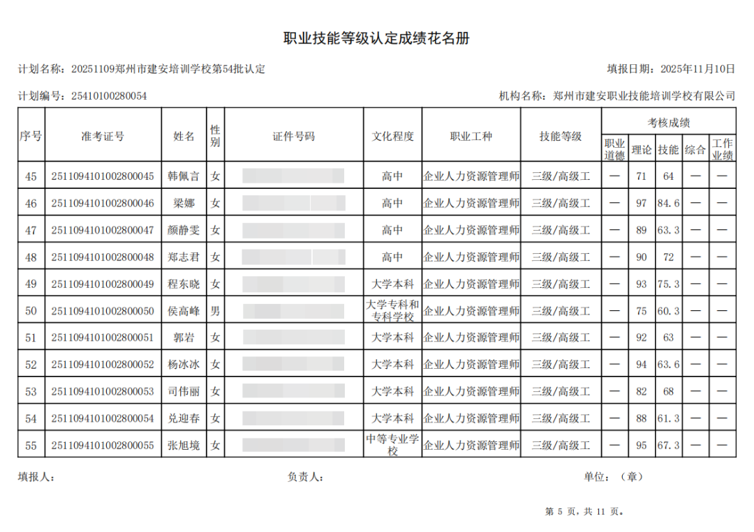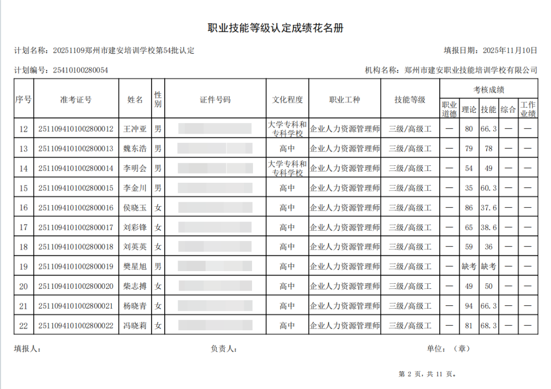 2025年11月9日,在郑州市建安职业技能培训学校进行的第54批【企业人力资源管理师】【电工】职业技能等级认定考试,阅卷工作已结束,现将各位考生成绩予以公示,公示期为5天,公示期限为:2025年11月12日至2025年11月16日。