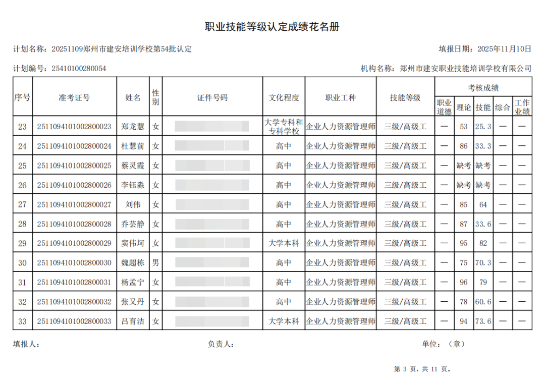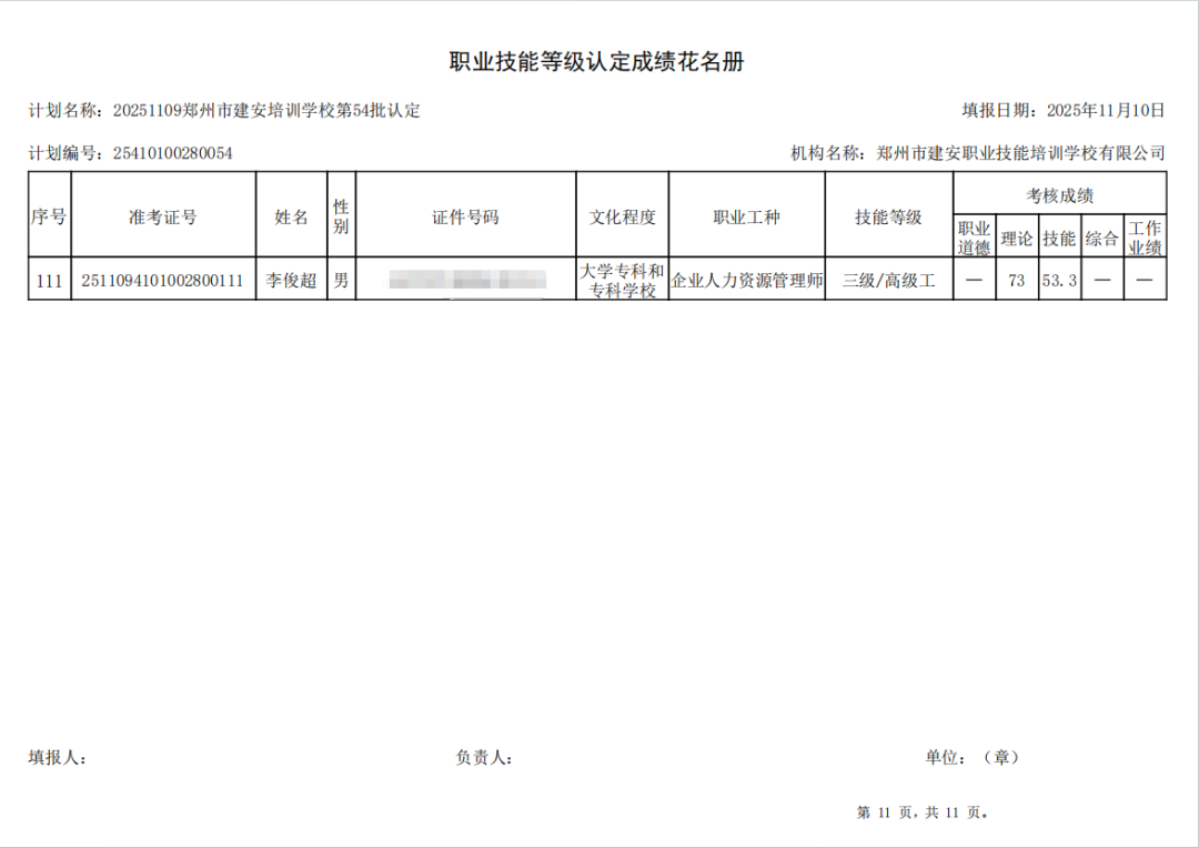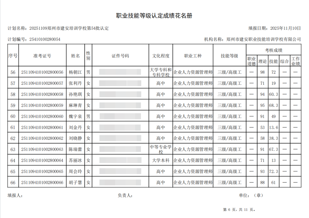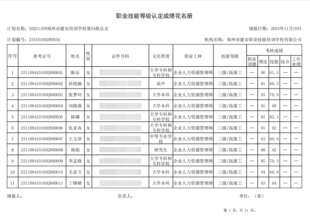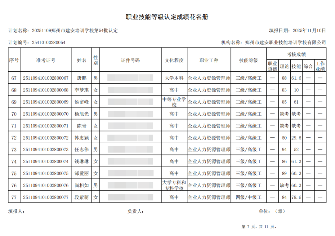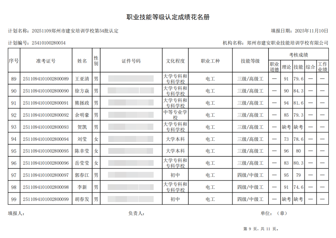 2025年11月9日,在郑州市建安职业技能培训学校进行的第54批【企业人力资源管理师】【电工】职业技能等级认定考试,阅卷工作已结束,现将各位考生成绩予以公示,公示期为5天,公示期限为:2025年11月12日至2025年11月16日。