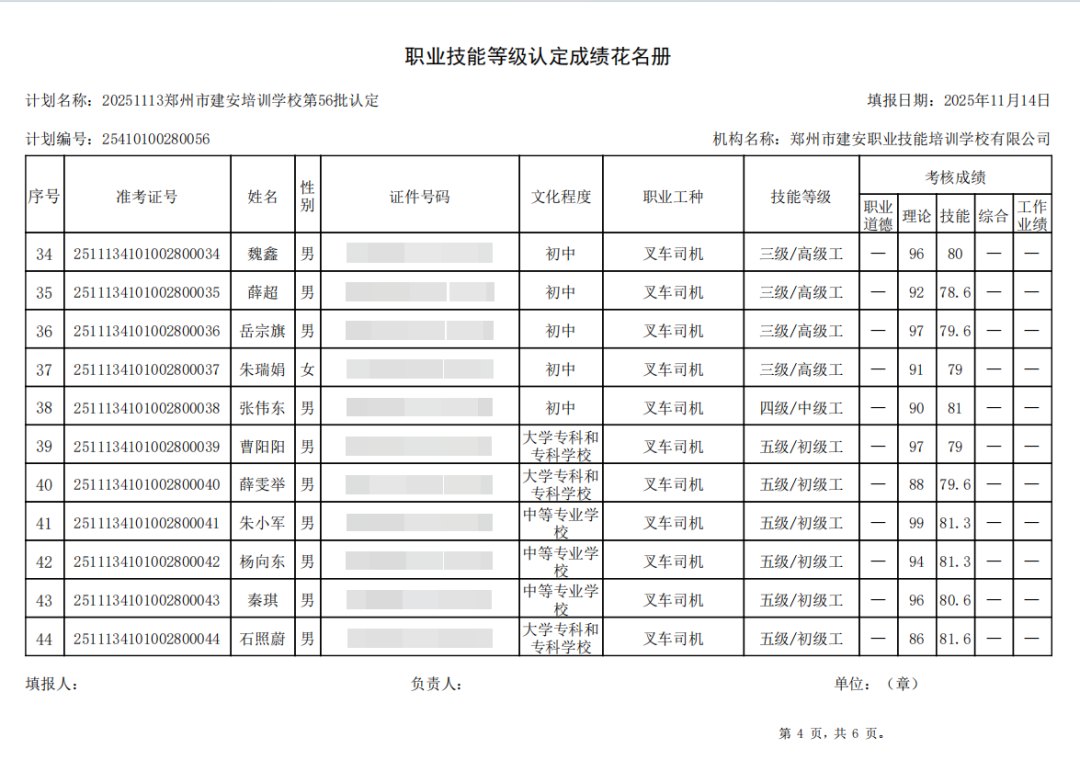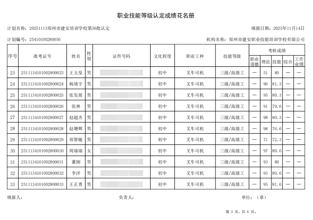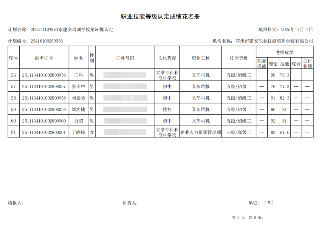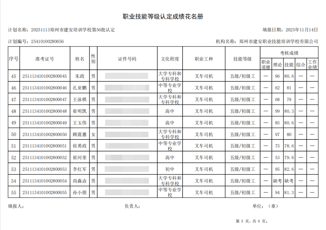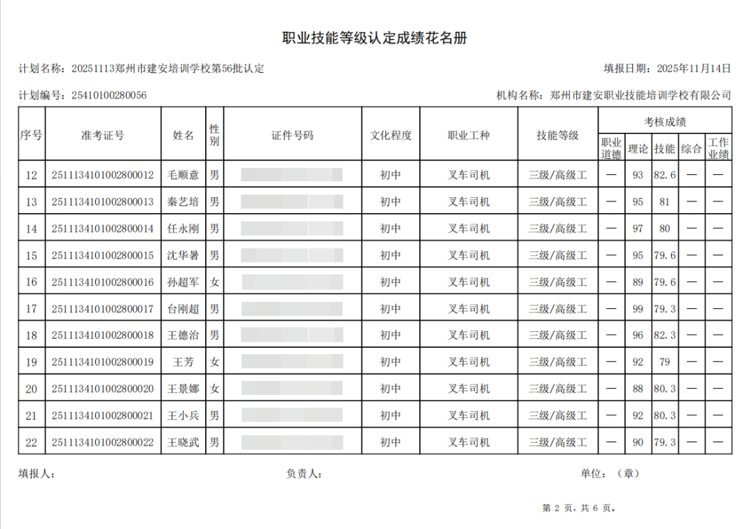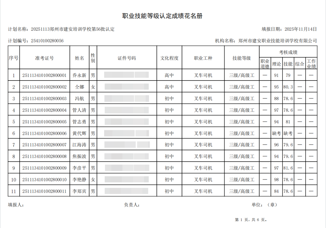 2025年11月13日,在郑州市建安职业技能培训学校进行的第56批【叉车司机】【企业人力资源管理师】职业技能等级认定考试,阅卷工作已结束,现将各位考生成绩予以公示,公示期为5天,公示期限为:2025年11月14日至2025年11月18日。
