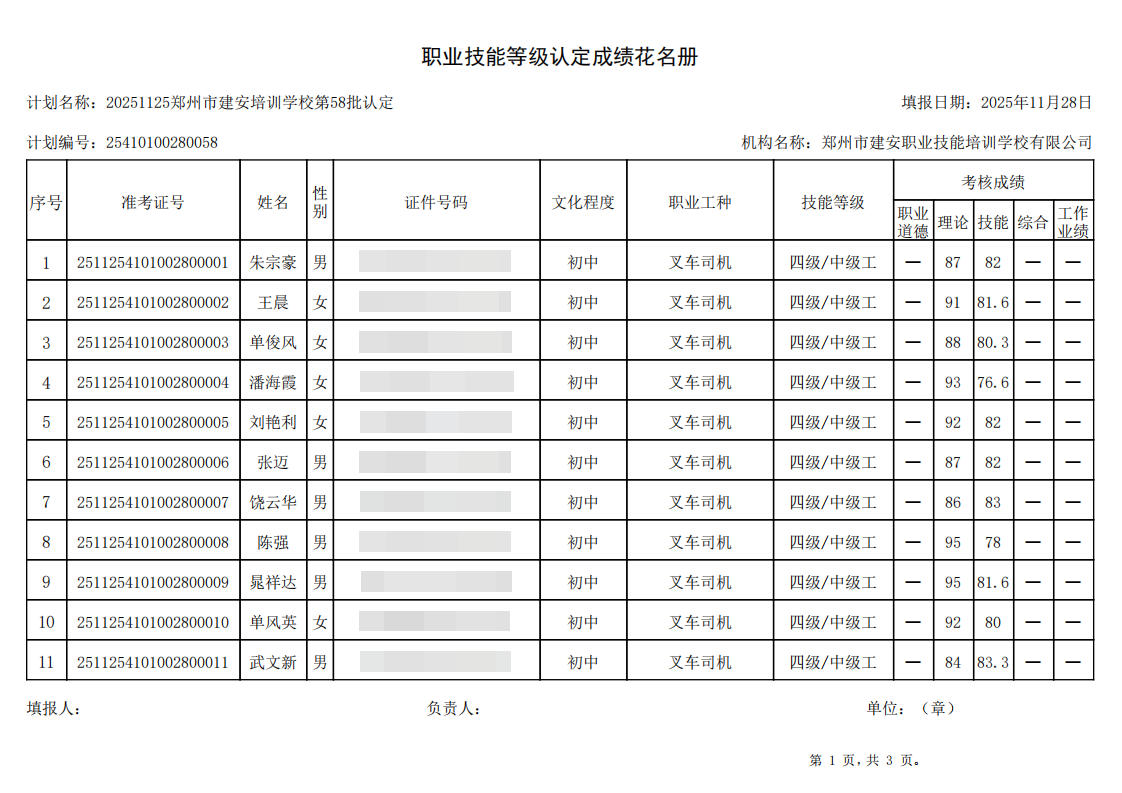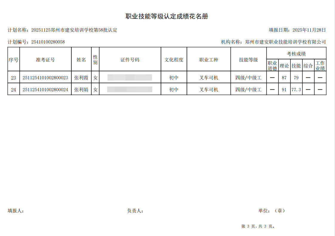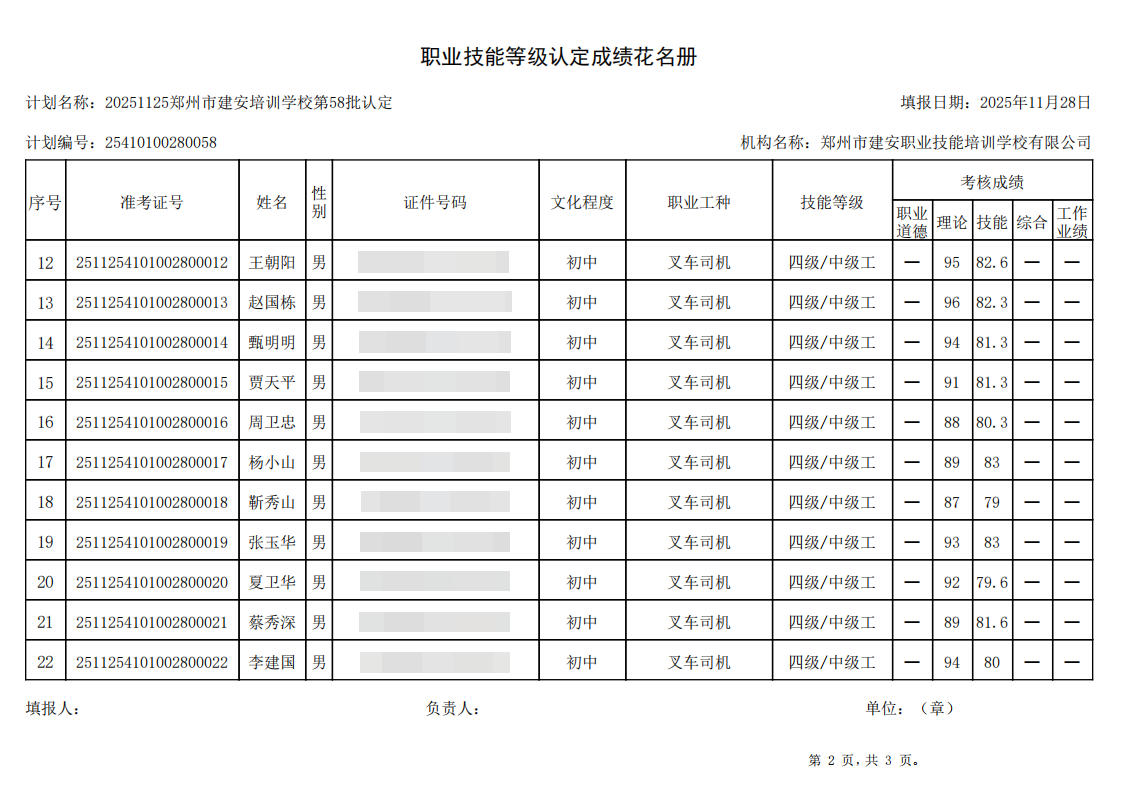 2025年11月25日,在郑州市建安职业技能培训学校进行的第58批【叉车司机】职业技能等级认定考试,阅卷工作已结束,现将各位考生成绩予以公示,公示期为5天,公示期限为:2025年11月28日至2025年12月2日。