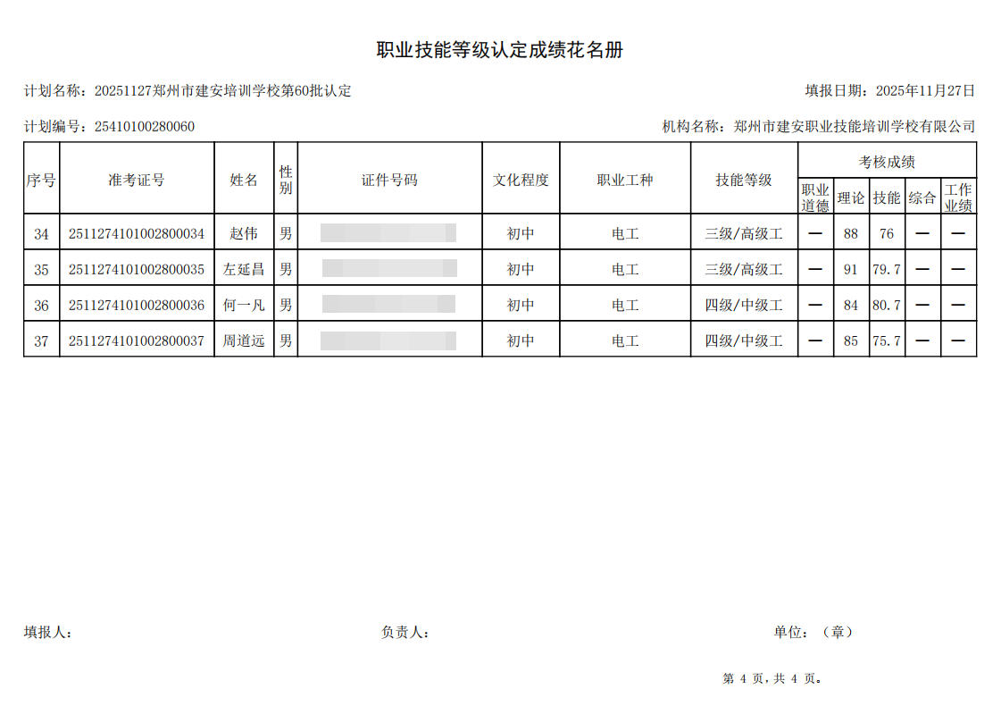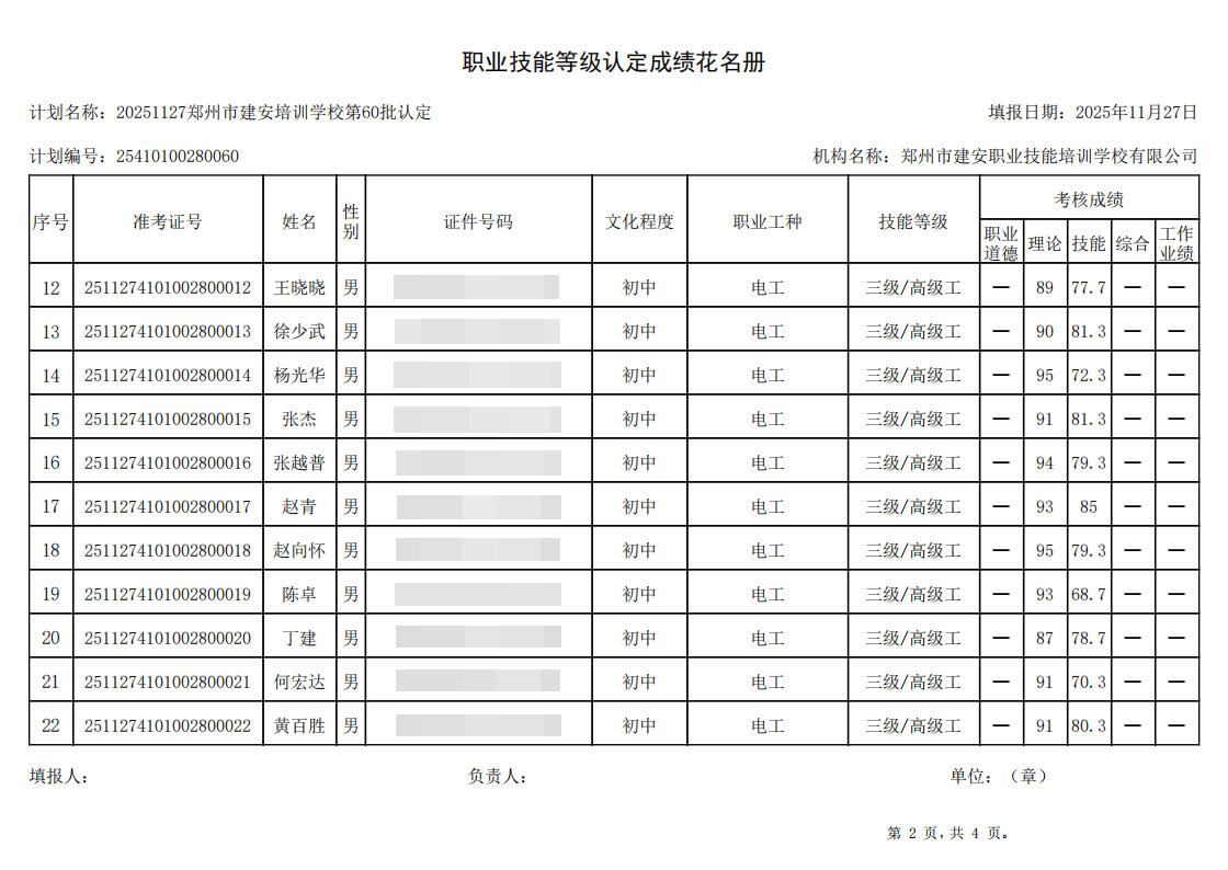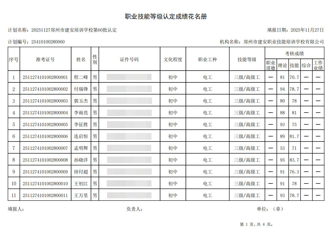 2025年11月27日,在郑州市建安职业技能培训学校进行的第60批【电工】职业技能等级认定考试,阅卷工作已结束,现将各位考生成绩予以公示,公示期为5天,公示期限为:2025年11月28日至2025年12月2日。