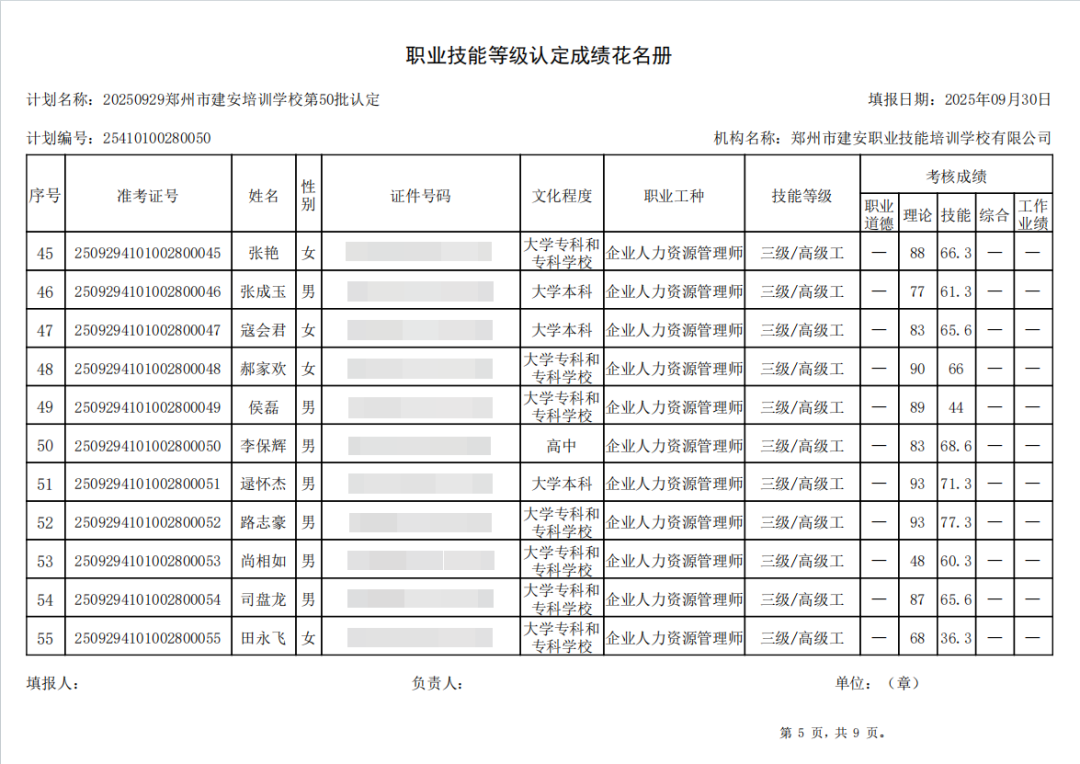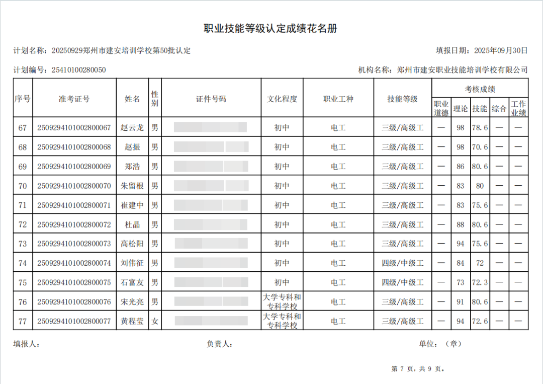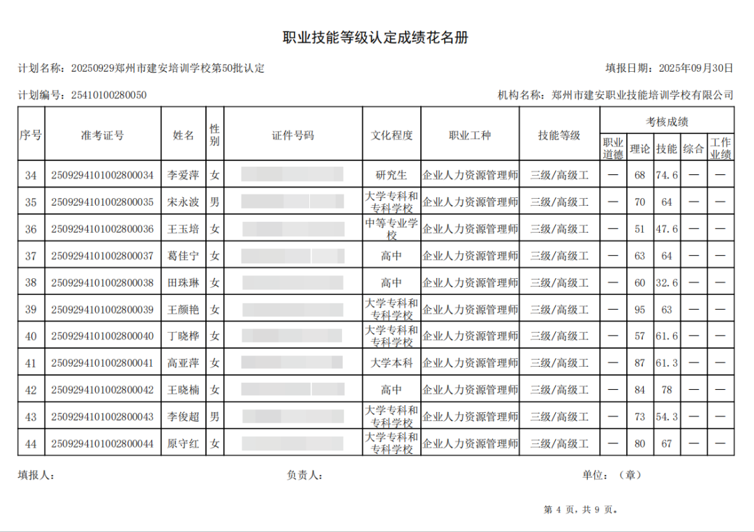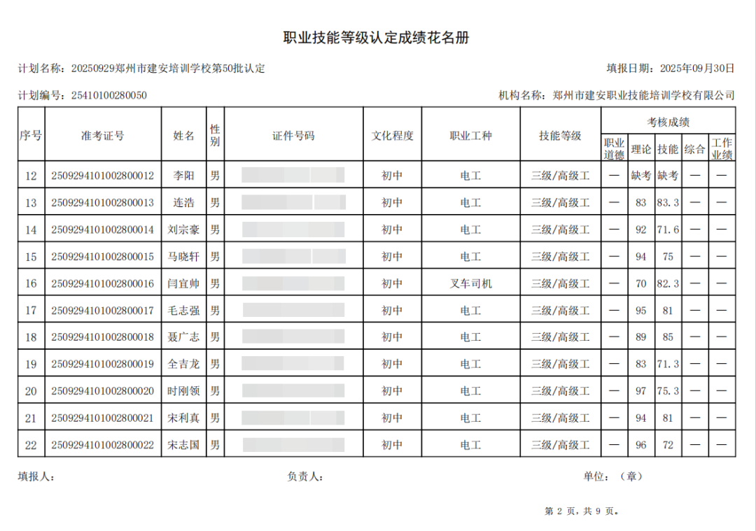2025年9月29日,在郑州市建安职业技能培训学校进行的第50批【电工】【叉车司机】【企业人力资源管理师】职业技能等级认定考试,阅卷工作已结束,现将各位考生成绩予以公示,公示期为5天,公示期限为:2025年9月30日至2025年10月4日。