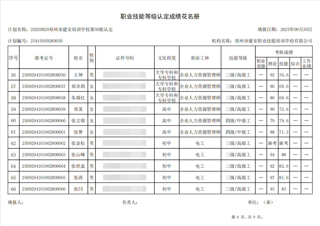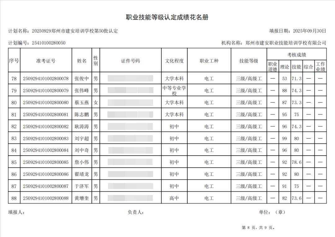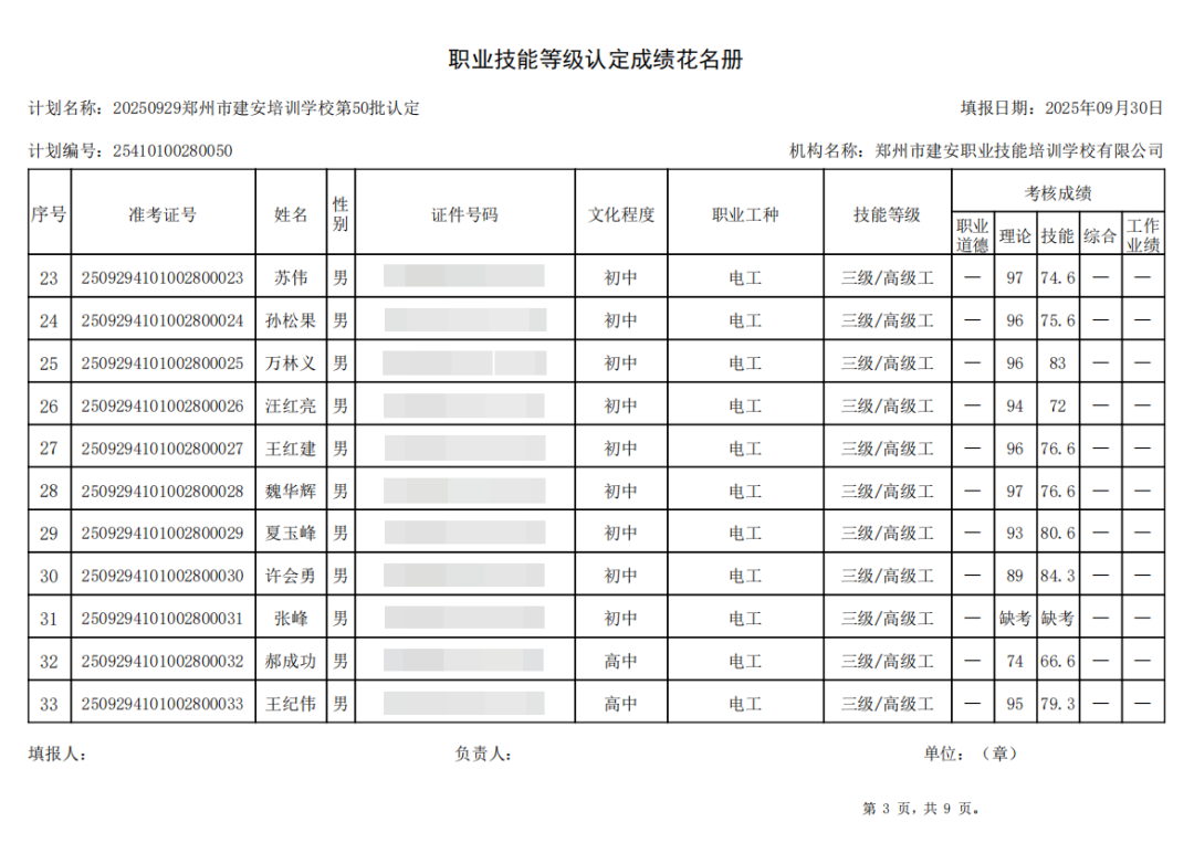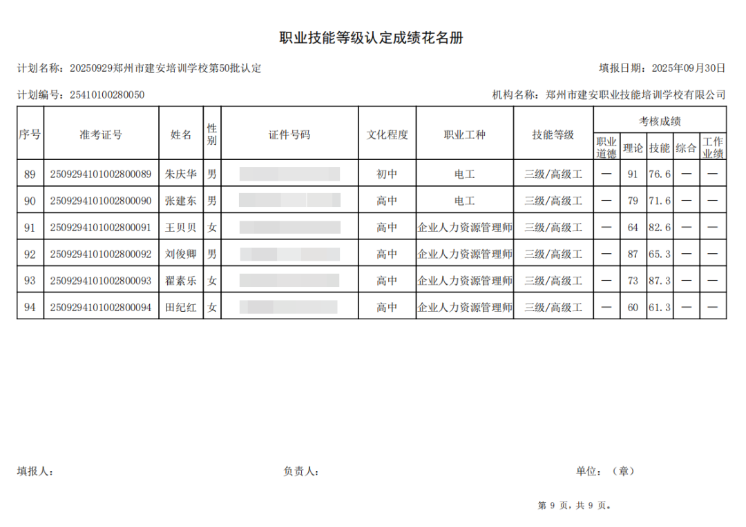 2025年9月29日,在郑州市建安职业技能培训学校进行的第50批【电工】【叉车司机】【企业人力资源管理师】职业技能等级认定考试,阅卷工作已结束,现将各位考生成绩予以公示,公示期为5天,公示期限为:2025年9月30日至2025年10月4日。