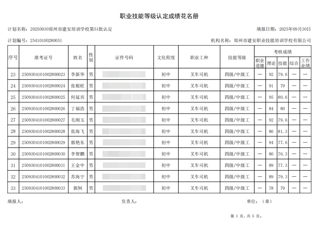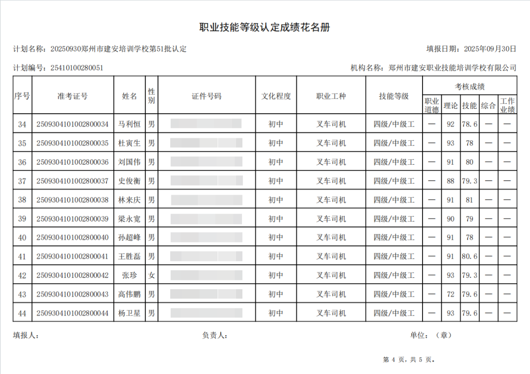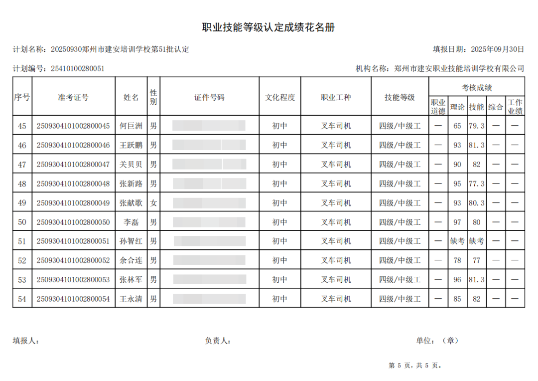 2025年9月30日,在郑州市建安职业技能培训学校进行的第51批【叉车司机】职业技能等级认定考试,阅卷工作已结束,现将各位考生成绩予以公示,公示期为5天,公示期限为:2025年9月30日至2025年10月4日。